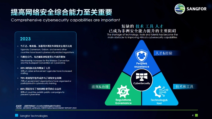 此外,深信服还为摩洛哥的一家电池合资企业解决过“大规模的互联网安全访问”需求,为政府和公共服务客户提供云化、平台化安全运营中心方案,在金融服务、电信服务等,对安全更加敏感的场景,则专门构建了融合AI+情报的高水平威胁防护方案。可以说,深信服已经深深融入非洲本地的数字化浪潮当中。