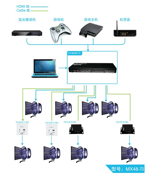 5) 延长HDMI达70m通过一条Cat5e类(或较好)线缆