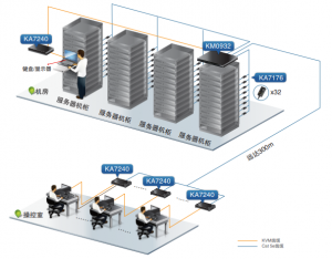 ●操控室4个坐席搭配4台KA7240,即可远程管控服务器,实现减少了桌面设备,提高了系统安全性。,机房内部放置1台KA7240,方便管控人员进入机房操作。