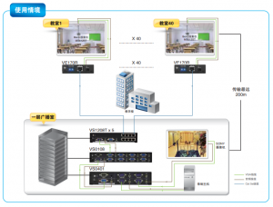 广州第四十七中学创办于1963年,先后评获广东省- -级*、广东省绿色*、广东省安全文明校园、广东省高中教学水平优秀*,是一家教育资源雄厚,信息化建设先进的*。目前对现有的信息发布系统进行改造升级,要求将广播室的视频信号发布至每个教室,通过教室的投影仪显示出来。透过该系统,周一例会或发布视频信息*无需集中学生到礼堂或操场开会,学生可以坐在教室直接观看。