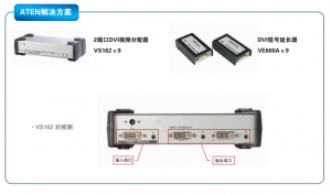 ●使用ATEN VS162 2口DVI视频分配器和VE600 60m网线传输的DVI信号延长器,使工作者在监控调度中心可以集中监控来自不同街道的路面信息。