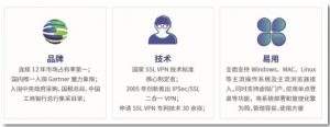 深信服SSL VPN集SSL/IPSec于一身,可以高效的帮助中小企业构建端到端的安全防护体系,业内拥有多项加密技术,多种认证方式、主从绑定等特色功能,*远程系统接入的用户身份安全、终端和数据安全、传输安全、应用权限安全和审计安全,具有快速、易用、全面等优势特点。SSL VPN自2008年起连续十二年在虚拟专网市场占有率*(数据来源于IDC),一直走在技术前沿,提供*服务,用户认可度*高。