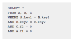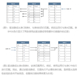 通过上列SQL语句,我们实现了3个表的连接。我们假定仅当所有统计信息都可用于此SQL语句中的表和索引时,数据库SQL优化器才会使用嵌套循环连接。在此示例中,我们通过查看数据发现,表C→B→A(图1)的驱动路径比A→B→C(图2)所花费的时间更长。 但是大多数数据库SQL优化器都会选择驱动路径C→B→A。发生这种情况是因为C.f2具有*索引,并且数据库SQL优化器并不知道需将从C.key2中返回哪些值。从该示例可以看出,检索的记录数量以及处理执行计划的成本需要数据本身来确定。而数据库SQL优化器并没有获得此信息,因此无法选择*的执行计划。