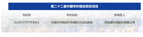 近日,第二十二届中国专利奖评审结果公示,经国家知识产权局评选,深圳市共获中国专利金奖4项,中国专利银奖5项。其中,深信服科技股份有限公司凭借“对虚拟网络进行恢复的方法和系统”的发明专利斩获得中国专利银奖!
