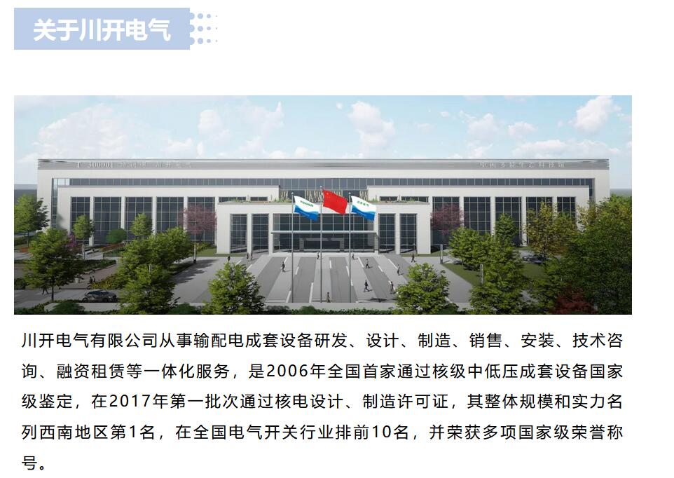 川开电气有限公司从事输配电成套设备研发、设计、制造、销售、安装、技术咨询、融资租赁等一体化服务,是2006年*通过核级中低压成套设备*鉴定,在2017年*批次通过核电设计、制造许可证,其整体规模和实力名列西南地区第1名,在全国电气开关行业排前10名,并荣获多项*荣誉称号。