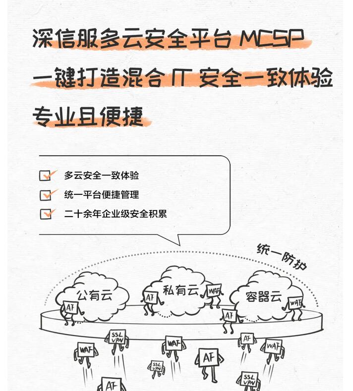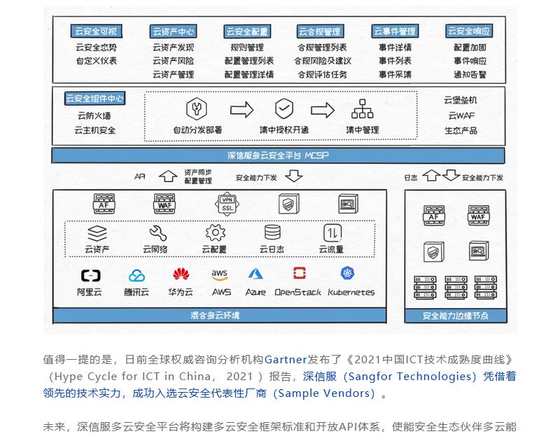 深信服云安全业务以混合多云一致安全为基石,通过深信服多云安全平台全面连接阿里云、腾讯云、华为云、AWS、OpenStack、VMware及Kubernetes等各类公有云、私有云和容器云,可实现云主机安全、云WAAP、云防火墙、云日志审计等各类云安全组件在各个云环境中的按需分发和自动部署,帮助用户实现混合多云架构下的统一资产管理、统一云安全配置管理、统一云合规管理和统一云安*力管理。
