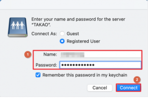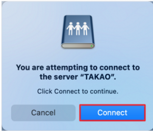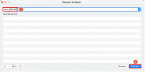 - 输入 “smb://” 并输入 Synology NAS 的主机名或 IP 地址。在这里以 “smb://TAKAO” 为例。单击连接以继续。