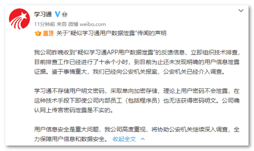 学习通官方针对传言“学习通被曝泄露1.7亿条信息”作出回应,其确认网上传言密码泄露为不实信息,到目前为止尚未发现明确的用户信息泄露证据,公安机关已经介入调查。