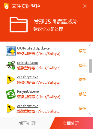 判断是否中了感染型病毒,可以通过两个方式:一是看报毒名,火绒的报毒名以“Virus”开头,遇到后直接清理即可(注意,其它安全软件报毒未必相同,不作参考);二是如果很多看似正常的软件都被报毒了,就要留心注意了,八成是中了感染型病毒了。