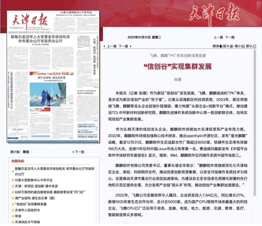 作为滨海新区“信创谷”坚实底座,飞腾、麒麟软件组成的“PK”体系,逐步成为新区信创产业的“双子星”。记者从滨海新区科技局获悉,2023年,新区将围绕飞腾、麒麟软件等龙头企业延链补链强链,着力构建“头部企业+创新平台”模式,推动建设TCL中环新材料创新研究院、麒麟先进操作系统创新中心等一批创新联合体,加快实现信创产业集群发展。