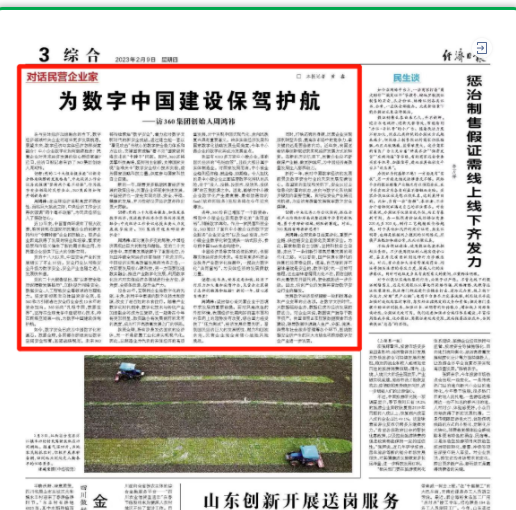 2023年2月9日,《经济日报》刊发《为数字中国建设保驾护航——访360集团人周鸿祎》,文章聚焦数字经济领域相关企业迎来的发展机遇。