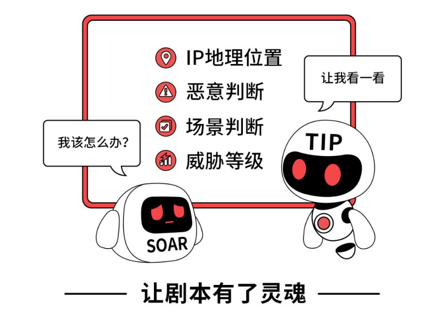 发生安全事件后,SOAR调用TIP的API接口,根据返回的威胁情报信息(如:地理位置、威胁标记、标签集合等),决策采取何种动作,自动调用下游安全产品进行威胁拦截,精准、高效地完成安全事件应急响应。