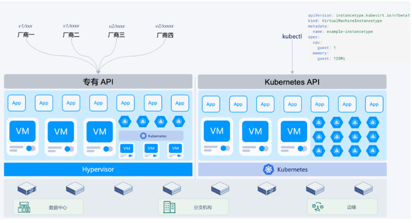 左:以 Coexist 方式融合管理容器和虚拟机右:使用 KubeVirt 融合管理容器和虚拟机