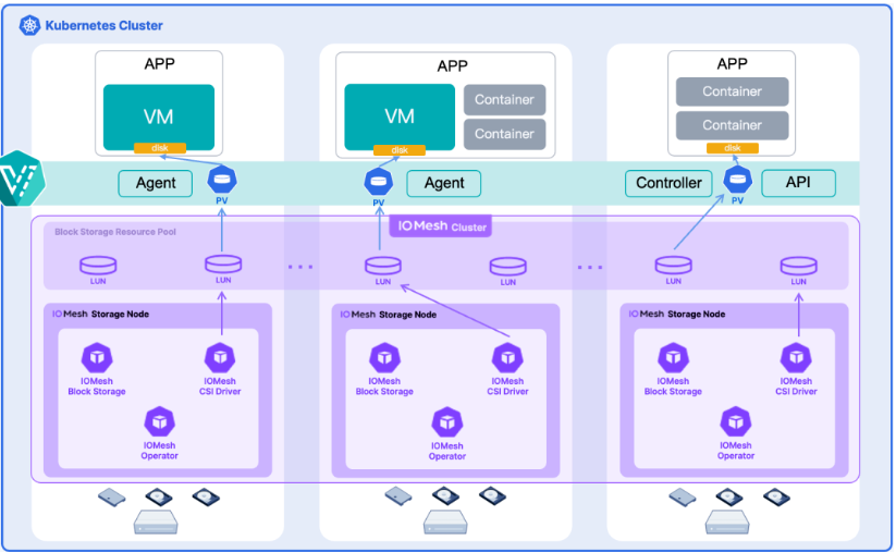 IOMesh 是 SmartX 自主研发并经过生产环境验证的 Kubernetes 原生的企业级分布式存储产品。作为一种 Kubernetes 原生的存储解决方案,IOMesh 能够与 Kubernetes *集成,实现融合部署并提供一致的容器与虚拟机存储支持,可以很好地支撑 KubeVirt 场景。方案架构如下图所示。
