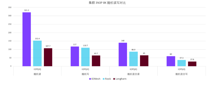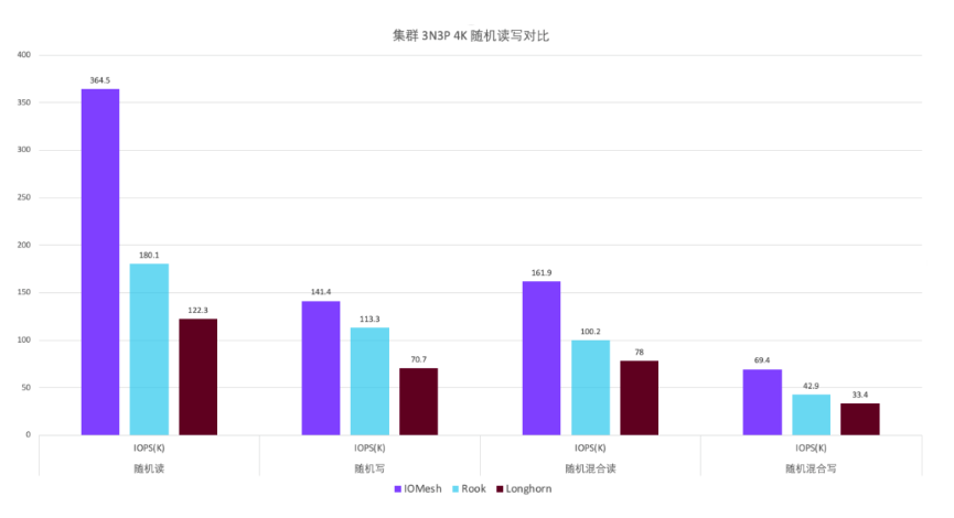 通过以下的性能测试数据,可以直观地感受到 IOMesh 对比其他 K8s 存储的性能优势:
