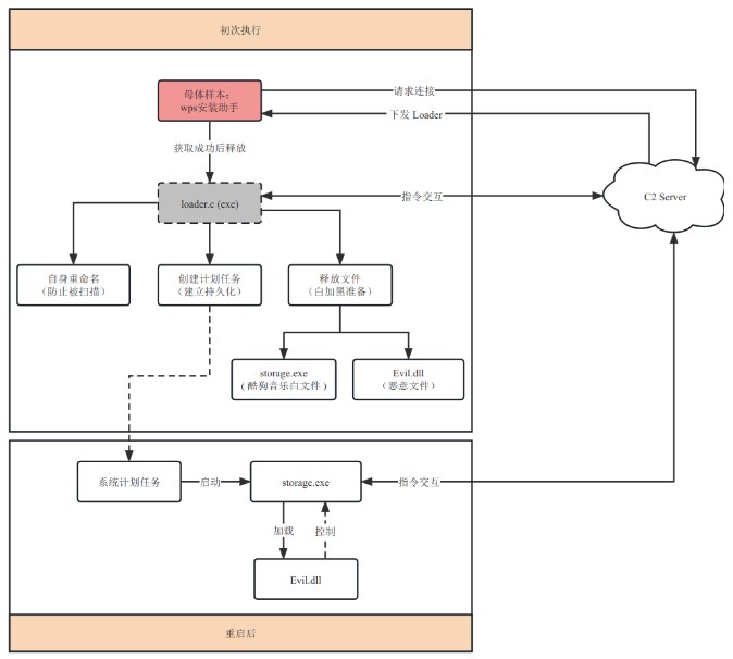 以今年“大出风头”的银狐系列工具为例,下图展示了某个银狐变种样本执行后的执行逻辑(部分):