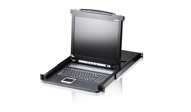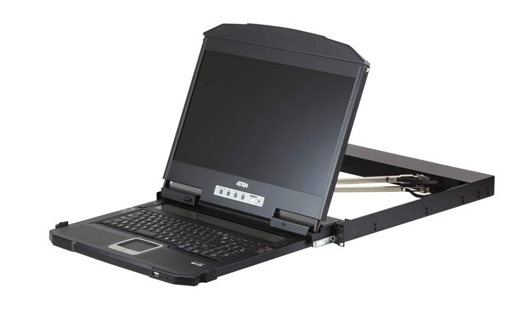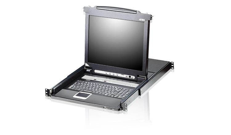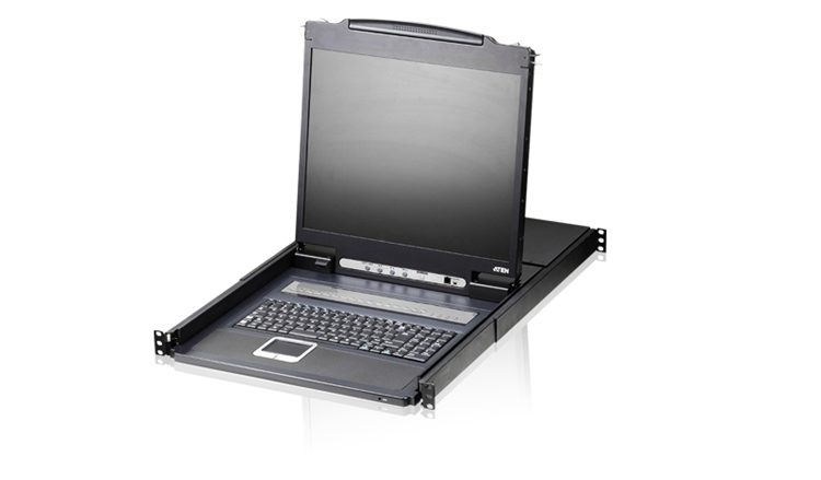 KVM console with 17″ LED-backlit LCD monitor in a sliding housing with top and bottom clearance for smooth operation in a 1U high system rack