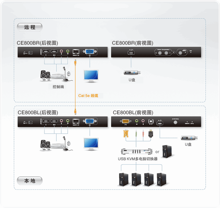 通过Cat 5e线缆连接远程与本地设备,*远达250m