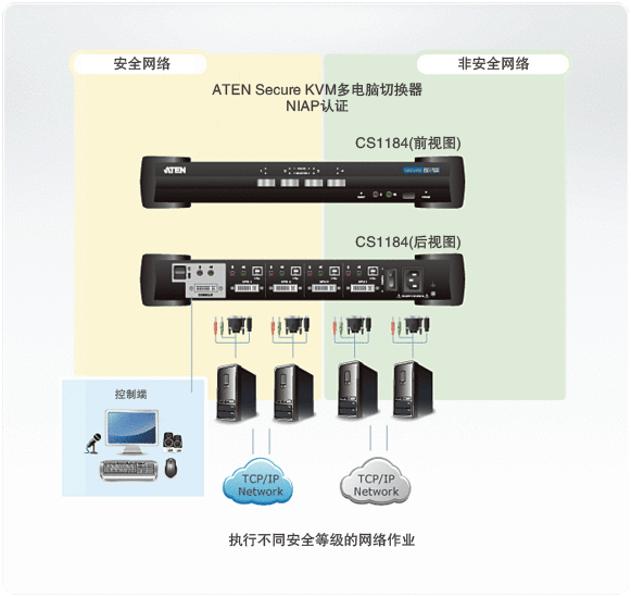 结合安全及控制的USB连结 – CS1182可以让您通过由一台键盘、显示器、及鼠标组成的KVM控制端,整合访问不同安全层级的多个工作站。/