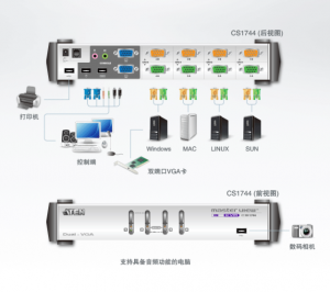 CS1744 KVM Switch integrates functions of video signal dual output and USB KVM switches. It allows a computer with dual-screen support to pair with two VGA/SVGA/Multisync displays via a USB keyboard and mouse. Furthermore, CS1744 provides 1 USB port on each of the front and rear panels, allowing each server to share any USB peripheral device that is connected to this HUB.