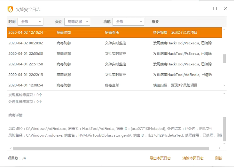 图:火绒拦截黑客工具和病毒的日志