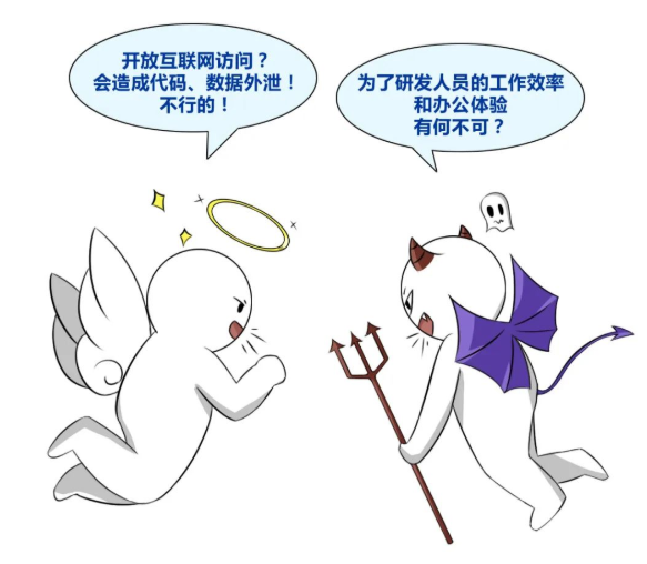 尤其在研发这类涉及数据、代码量巨大的场景下,即便使用“双PC”模式,也无法百分百控制两台PC之间文件流转的方向,数据泄密的风险极大。
