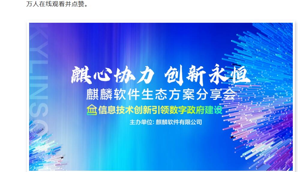 一直以来,麒麟软件持续打造自主创新生态体系,构建“安全”“易用”和“好用”高质量的行业应用生态,持续打造openKylin(开放麒麟)操作系统根社区;*国产操作系统生态发展,助力数字经济建设。未来,麒麟软件生态方案分享会还将围绕行业数字化建设等话题,邀请相关伙伴进行线上分享。关注麒麟软件,精彩不容错过!