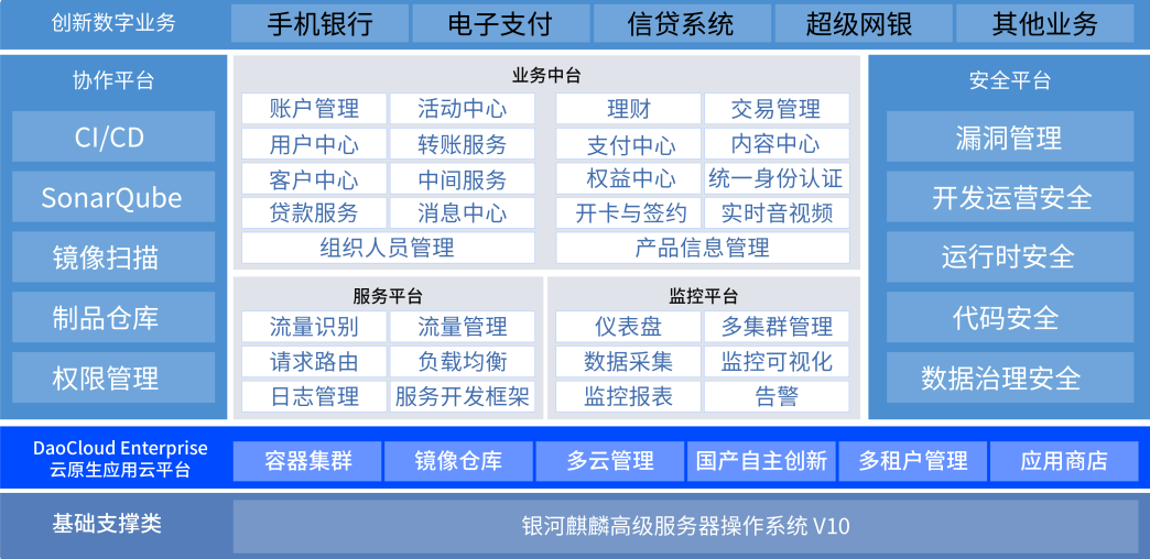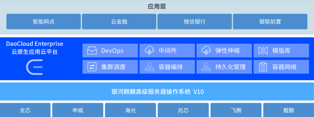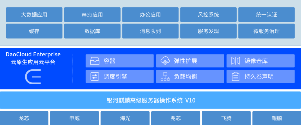 方案以银河麒麟*服务器操作系统 V10 为底座,搭载 DaoCloud Enterprise 云原生应用云平台,针对企业级关键业务对主机系统的高可靠、安全、高性能和可扩展的需求,提供企业需要的容器运行时、网络、存储、监控、镜像仓库、负载均衡、身份验证和运维管理等模块,为多样化的业务负载提供稳定、高效、安全的运行环境,在支撑微服务应用、数据中间件、大数据系统、人工智能计算等场景均得到充分验证,带动企业走上提质增效、敏捷创新的发展路线。