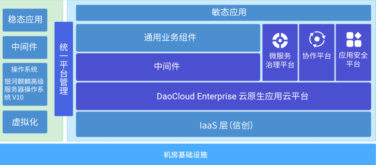 在行业双态场景,企业在数字化转型过程中,内部会同时存在敏态和稳态两种不同形态的业务。在该方案中,基于银河麒麟操作系统构建稳态 IT,支持长期性、安全性和稳定性,基于 DaoCloud Ennterprise 云原生应用云平台打造敏态 IT,覆盖应用全生命周期的管理,提供可视化的应用编排,实现一键式应用部署,支持技术和业务快速迭代和创新。二者的有效结合满足了企业系统向“双态”转型,应用架构既体现高性能、高弹性、高可用性又符合高规范性、低风险和低成本的需求。