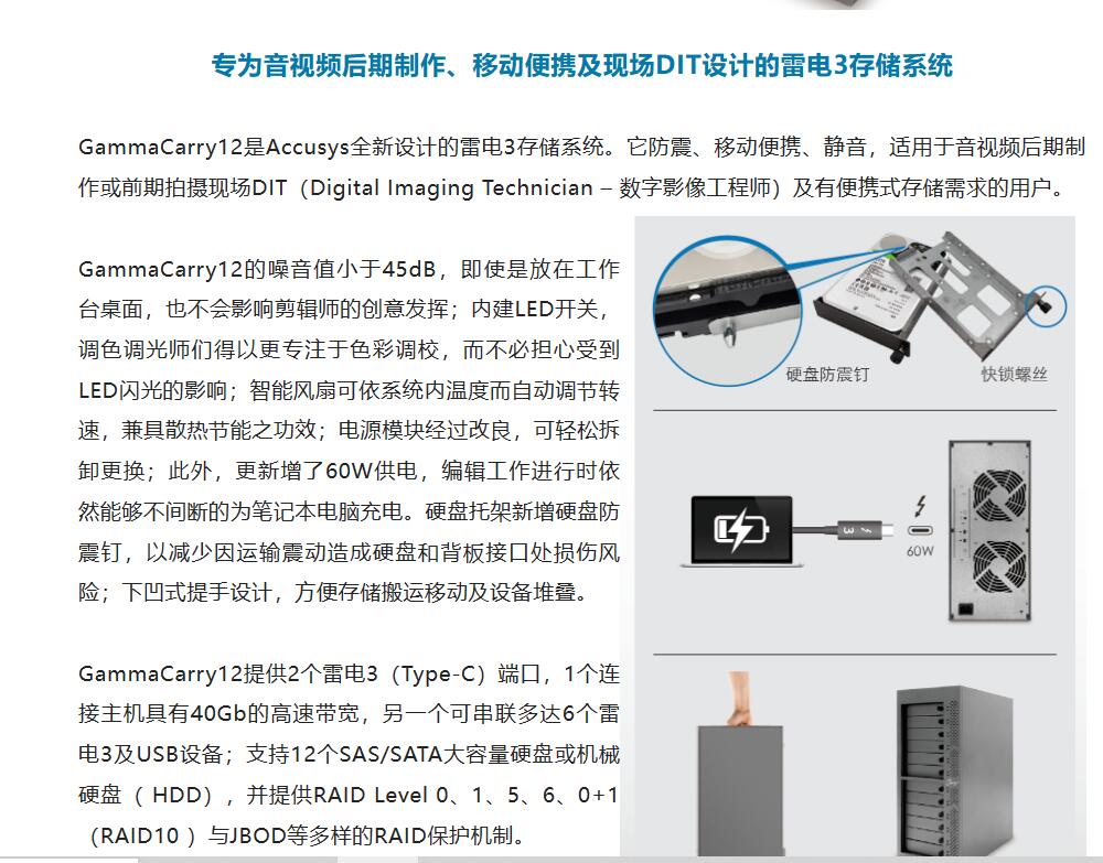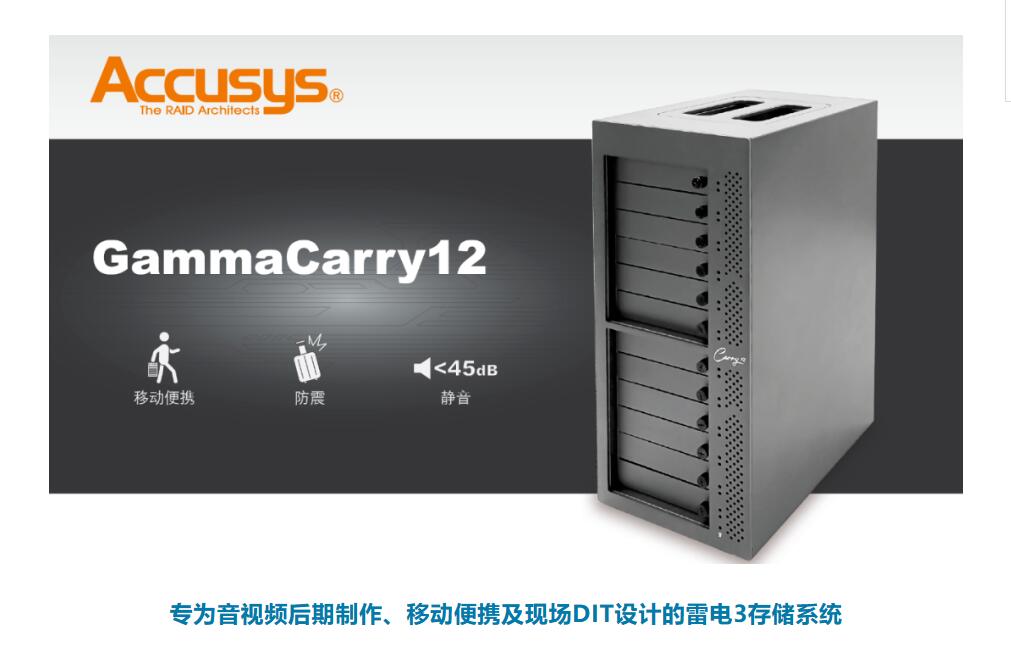 GammaCarry12是Accusys全新设计的雷电3存储系统。它防震、移动便携、静音,适用于音视频后期制作或前期拍摄现场DIT(Digital Imaging Technician – 数字影像工程师)及有便携式存储需求的用户。图片
