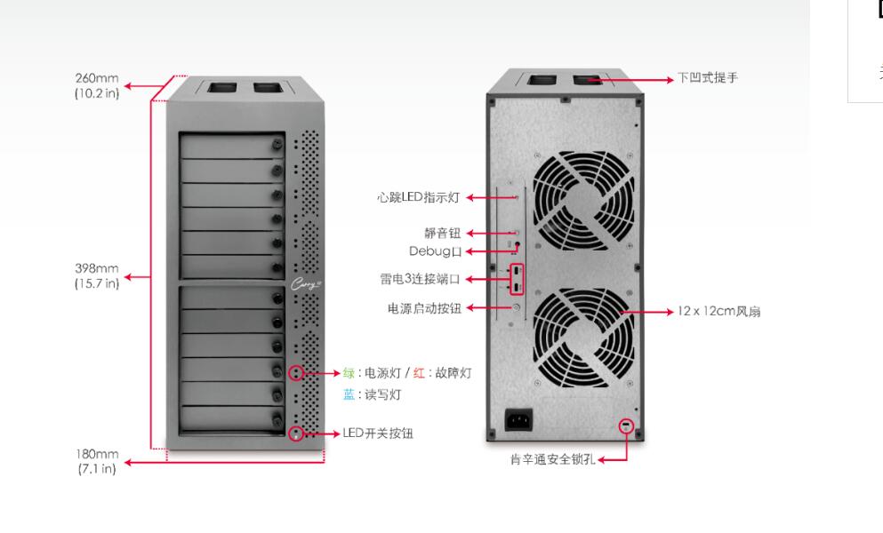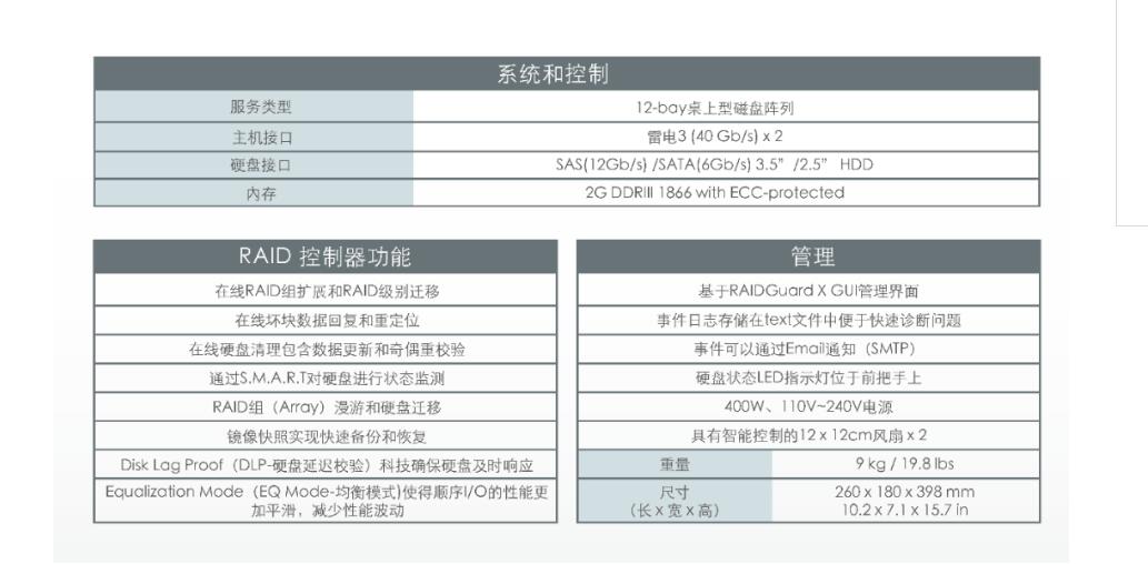 GammaCarry12提供2个雷电3(Type-C)端口,1个连接主机具有40Gb的高速带宽,另一个可串联多达6个雷电3及USB设备;支持12个SAS/SATA大容量硬盘或机械硬盘( HDD),并提供RAID Level 0、1、5、6、0+1(RAID10 )与JBOD等多样的RAID保护机制。