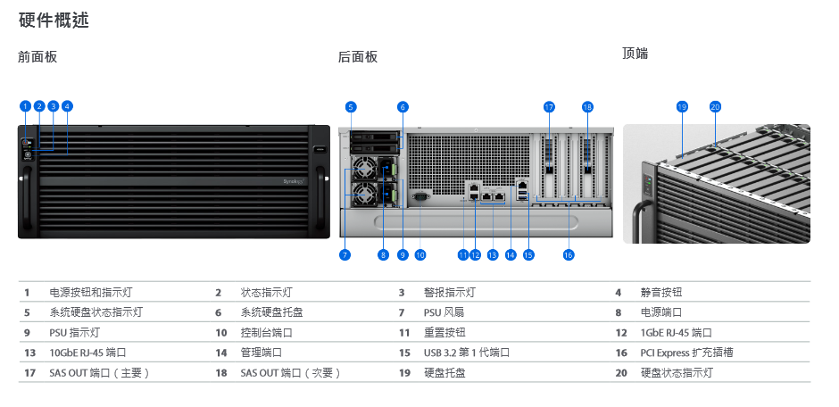 • 存储硬盘:60 x 3.5 英寸 Synology SAS HDD 或 2.5 英寸 Synology SATA SSD(不含硬盘)7