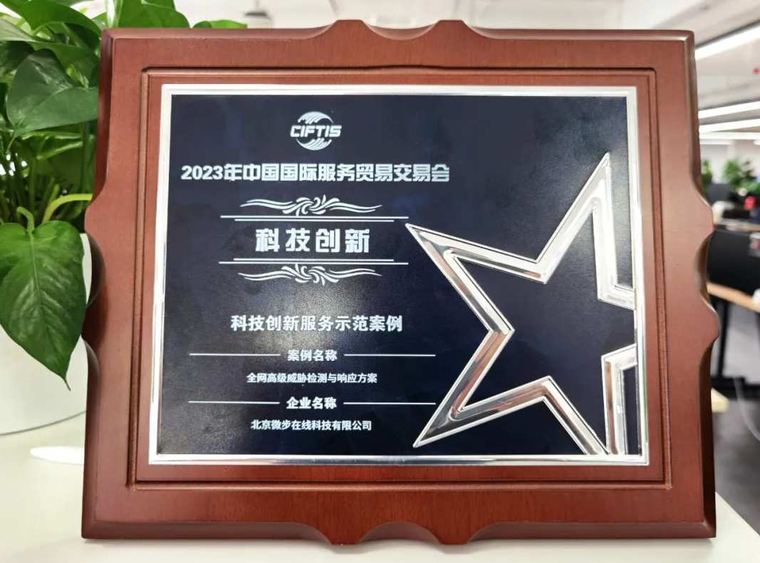 在服贸会主会馆国家会议中心的主通道上,2023年中国国际服务贸易交易会服务示范案例展示墙格外引人注目。在9月4日召开的服贸会服务示范案例交流会上,2023年服贸会100个服务示范案例正式揭晓,微步全网威胁检测与响应方案成功入选,被评为服贸会“科技创新服务示范案例”,并收录至2023年服贸会服务示范案例手册。