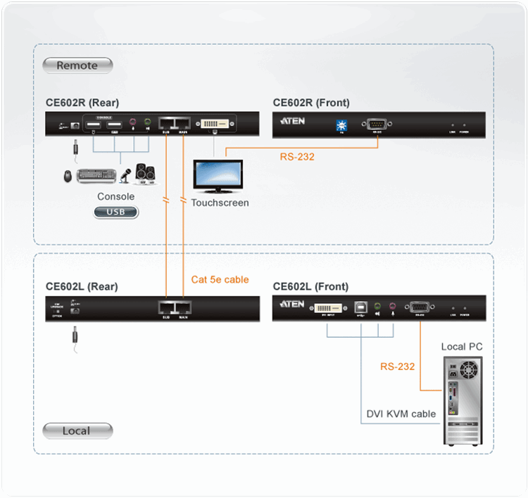 The CE602 is a DVI Dual Link and USB based KVM Extender with RS-232 serial functionality. It allows access to a computer system from a remote console (USB keyboard, monitor, and mouse). Because it allows access to a computer system from a remote console, the CE602 is perfect for use in any type of installation where you need to place the console where it is conveniently accessible, but you want the system equipment to reside in a safe location – away from the dust and dirt of the factory floor, or the harsh environmental influence of a construction site, for example. This allows users to deploy system equipment over large distances.