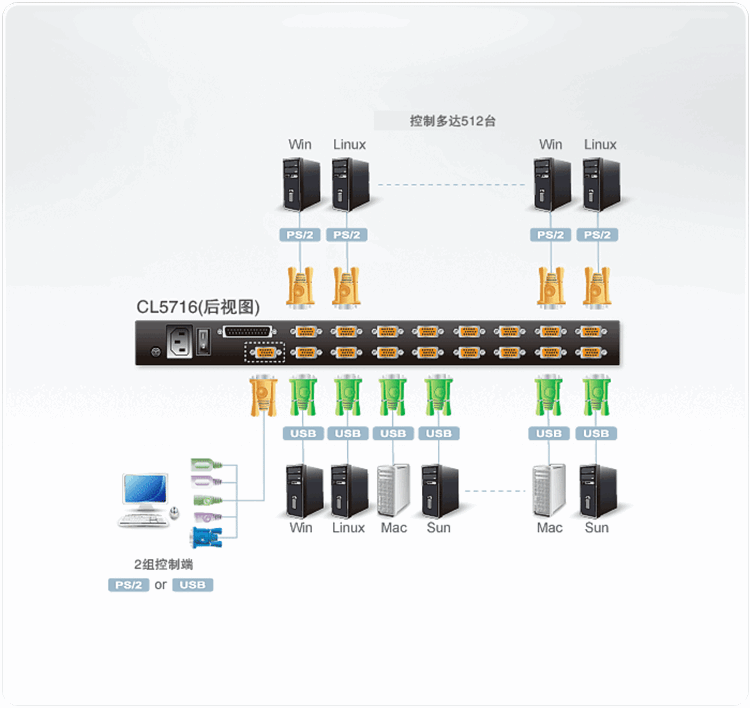 菊式串接另外31台设备 – 单一控制端可管理高达512台服务器(兼容的KVM多电脑切换器包括ACS1208A、ACS1216A、CS1708A、CS1716A)