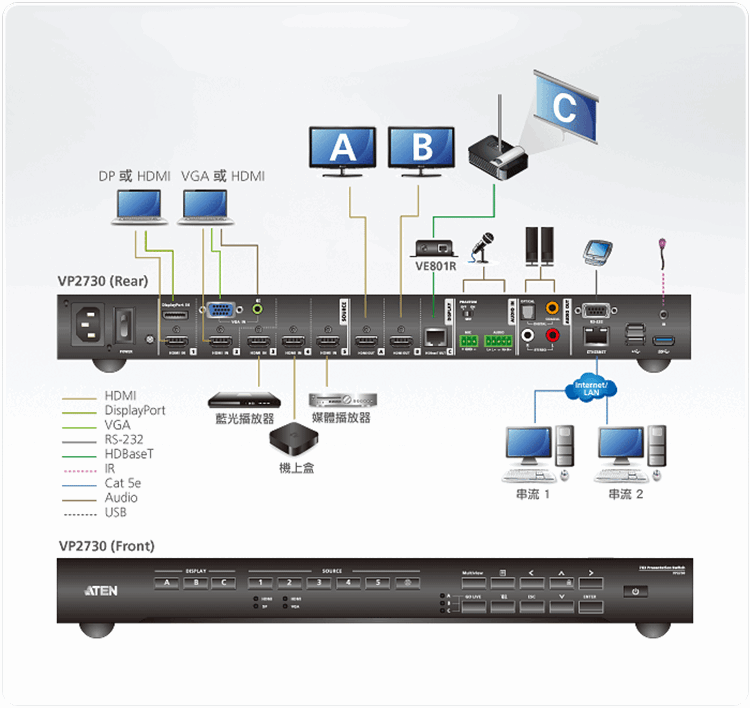 VP2730 is a multi-in-one presentation switch that integrates video matrix switch with scaler, streaming, audio mixer, HDBaseT extender, and analog-to-digital converter functions into one compact device. With seven multi-format inputs to two HDMI and one HDBaseT high-definition outputs, VP2730 empowers larger meetings and facilitates collaboration between local and remote participants in boardrooms, video conferencing rooms, lecture halls or distance learning classrooms.
