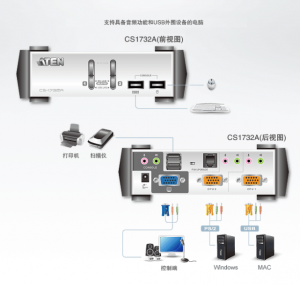 CS1732A 2 Port KVM Switch has built-in USB on each of the front and rear panels and audio signal connectors. It allows users to control the computer and peripheral devices via a signal console at ease.