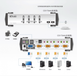 CS1734A内建前后端USB连接端口,并提供音频信号连接头,可让用户从单一的控制端轻松地集中控管电脑与外围设备。