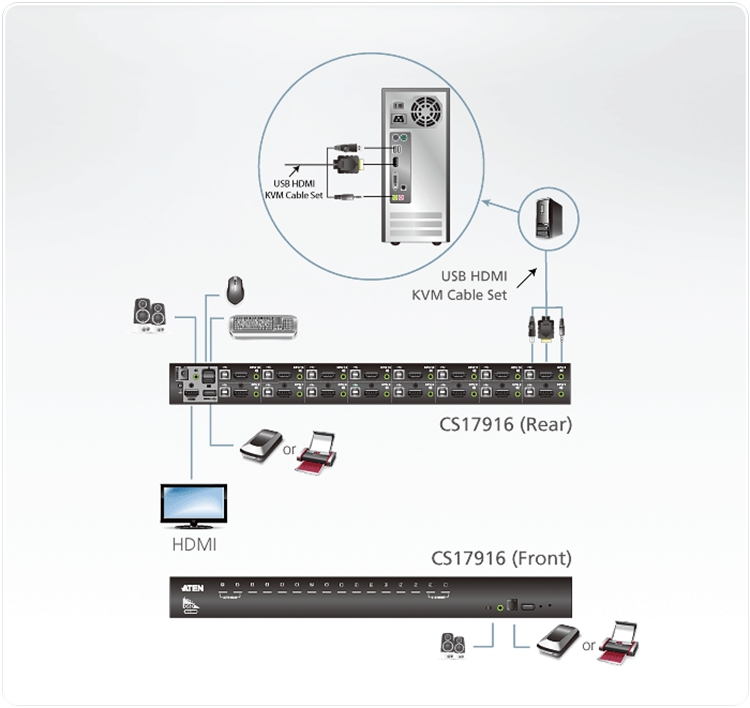 The CS17916 16-port USB HDMI KVM Switch is a multi-purpose appliance that consolidates access and control of up to 16 HDMI computers from a single USB keyboard, USB mouse, and monitor console.