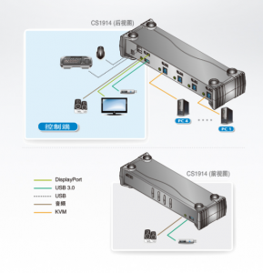 CS1914能让用户通过单一的控制端(USB键盘、USB鼠标与显示器)切换操作四台DisplayPort电脑。为了让用户可以简易操作设备,CS1914提供三种便利的切换电脑装置方式 – 通过前面板按键、鼠标或热键,用户可弹性切换并操作已连接在 CS1914上的任一电 脑。