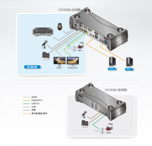 CS1922M支持独立切换功能,让用户通过CS1922M在操控一台电脑的同时,也可使 用另一台电脑的USB外围设备,无需额外添购USB集线器或独立式外围分享设备- 如打印机分享设备等。 此外,用户可利用CS1922M分享连接于CS1922M任一电脑上的音频;也能使用通过 DisplayPort线缆传送的HD音频,让用户享有事半功倍、多样化弹性操作的丰富体验。