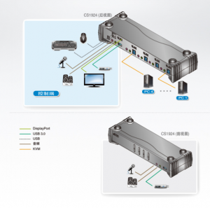 The ATEN CS1924 4-Port USB 3.0 4K DisplayPort KVMP™ Switch provides the latest innovations in desktop KVM switching technology for the increasing demand of higher video quality and transfer speeds on modern computers. The ATEN CS1924 offers an unprecedented performance of delivering 4K resolution, the next generation USB 3.1 Gen 1 hub with SuperSpeed 5 Gbps data transfer rates and enhanced user-friendly operations.