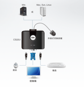 CS22U是一款2端口带线式USB KVM多电脑切换器,其内建一个外接式切换按键,用户可将CS22U主装置放于桌面下,仅保留此切换按键于桌面,即可简单且快速地切换电脑。