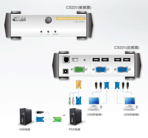 CS231为一功能强大、通过高效微处理器以控制电脑主机分享功能的设备。此款多人单工设备可供两位使用者通过自己的控制端(显示器、键盘和鼠标),分享使用同一台电脑。CS231支持USB接口的控制端及PS/2与USB接口电脑。