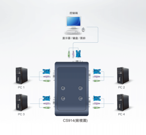 CS914为内建PS/2接口的KVM切换器,提供一组控制端管理4台服务器电脑主机,并可通过切换器上方的按键,或是通过控制端键盘上的热键组合,进行电脑的选择切换。这是单一控制端管理多电脑,*简便的解决方案。
